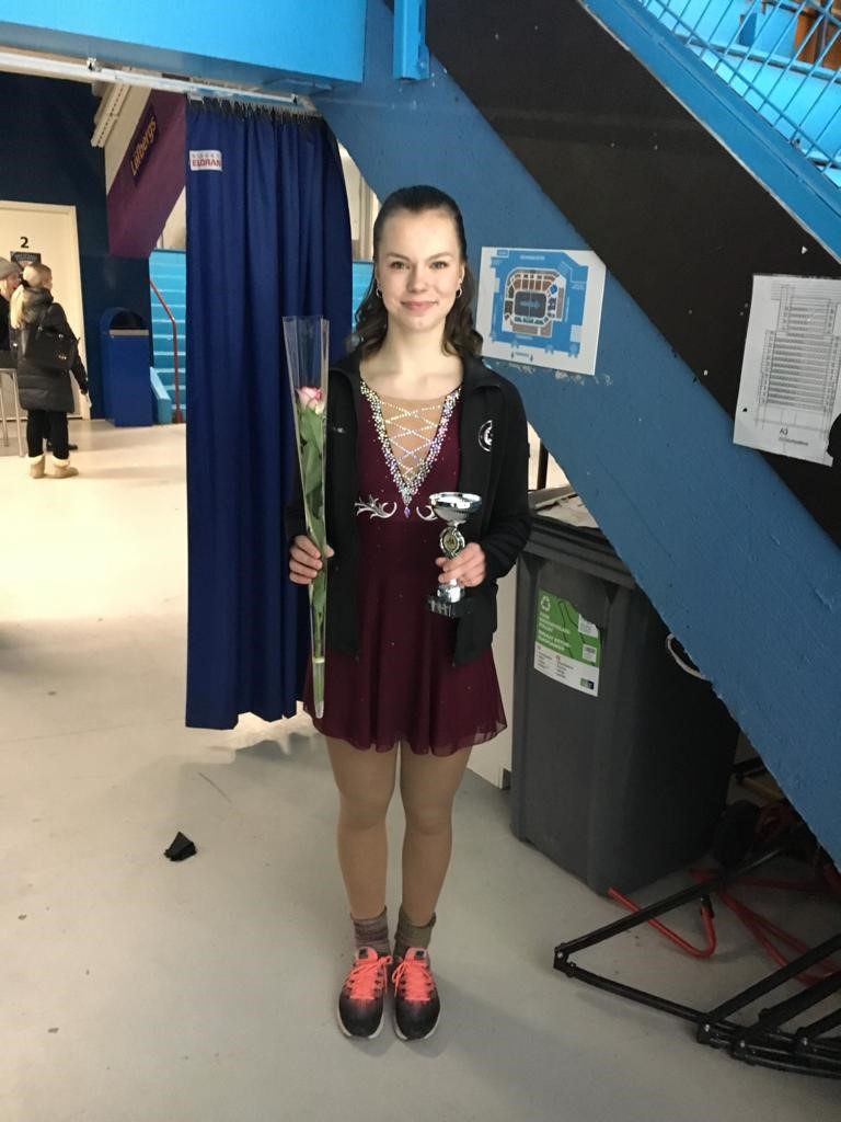 Hanna oli senioreissa 1./2 pistein: 97,52 ( LO 35,26 VO 62,26 ). Hannan mietteitä seuraavassa “Oli kiva päästä kisaamaan tänä viikonloppuna valintojen merkeissä mutta oli outo tunne, koska lohkossaan kisasi loppujen lopuksi vain yksi luistelija minun lisäkseni. Otin viikonlopun tosi rennosti ja sain nauttia luistelusta, mutta luistinten koukkujen kanssa ilmeni ongelmia eikä jääkään tuntunut hyvältä jalkojen alla. En päässyt lähellekään parastani kummassakaan ohjelmassa, varsinkaan vapaaohjelmassa, mikä harmittaa todella paljon. Nyt vain keskityn täysillä harjoitteluun ja pyrin saamaan mahdollisimman paljon toistoja kaikkeen välttääkseni typerät virheet ja nostaakseni suoritusvarmuutta entisestään. Vaikka olenkin tosi pettynyt, oli viikonloppu kaiken kaikkiaan hyvin opettavainen ja tiedän mihin suuntaan jatkan. ”
